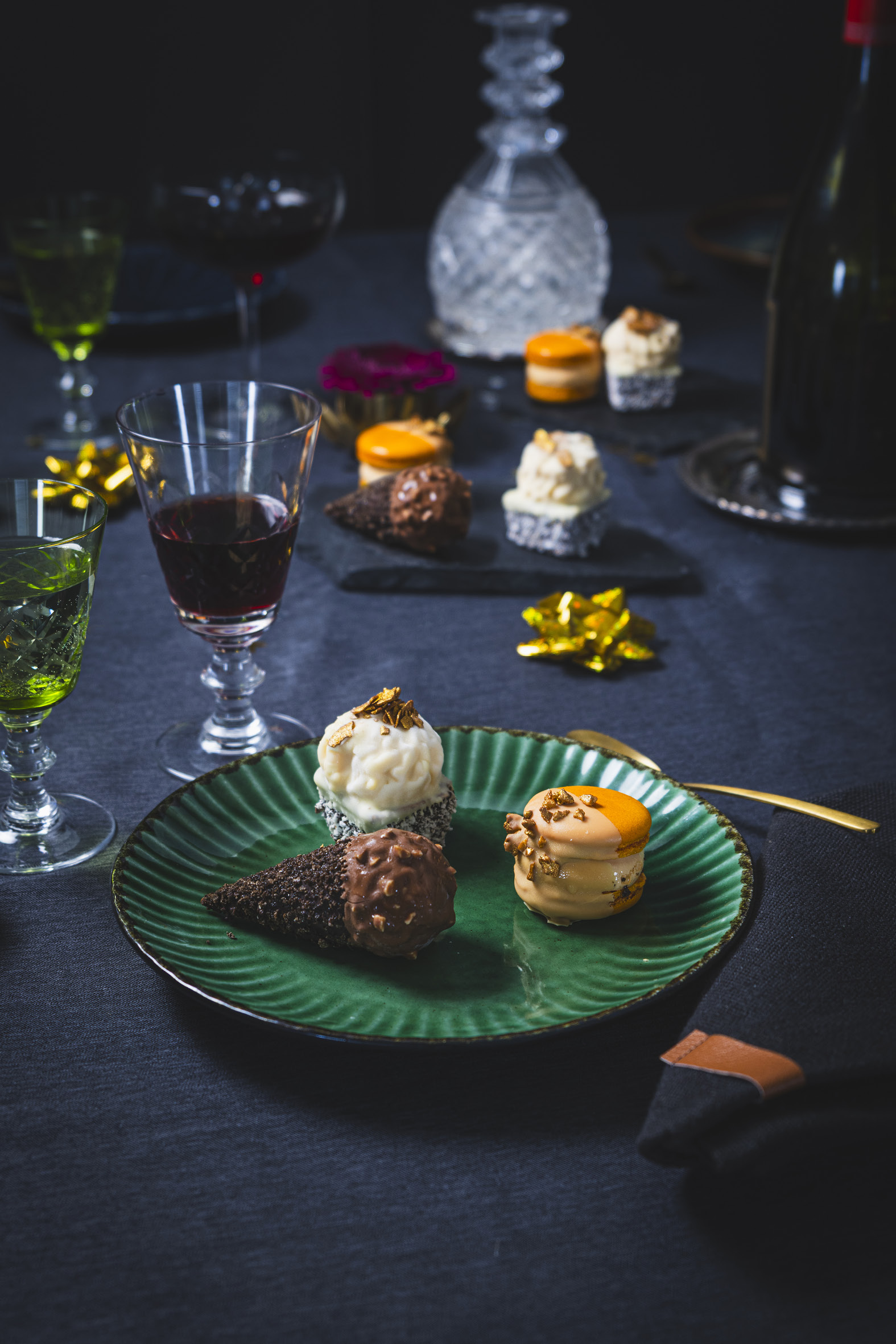 Menuen på årets sidste aften skal fuldendes med en dessert, der sætter et festligt punktum for en pragtfuld menu. Derfor afsluttes menuen med tre små og delikate fristelser. Nyd en sprød mini kakao vaffel som gemmer på en fyldig cremet chokoladeoplevelse inspireret af den klassiske Ferrero Rocher. Herefter følger en elegant macaron med blød saltet karamel, og sidst en frisk og eksotisk kokosvaffel fyldt med syrlig passion og havtorn.