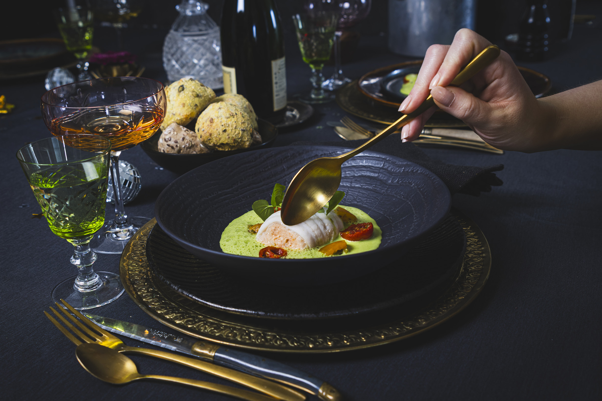 Aftenens forret byder på en elegant paupiette af frisk Vesterhavsfisk i en skøn og skummende basilikumssauce, det let løfter retten og tilføjer en frisk og aromatisk dybde. Forretten toppes med semi-dried tomater og frisk brøndkarse. Hertil stenovnsbagt kuvertbrød.