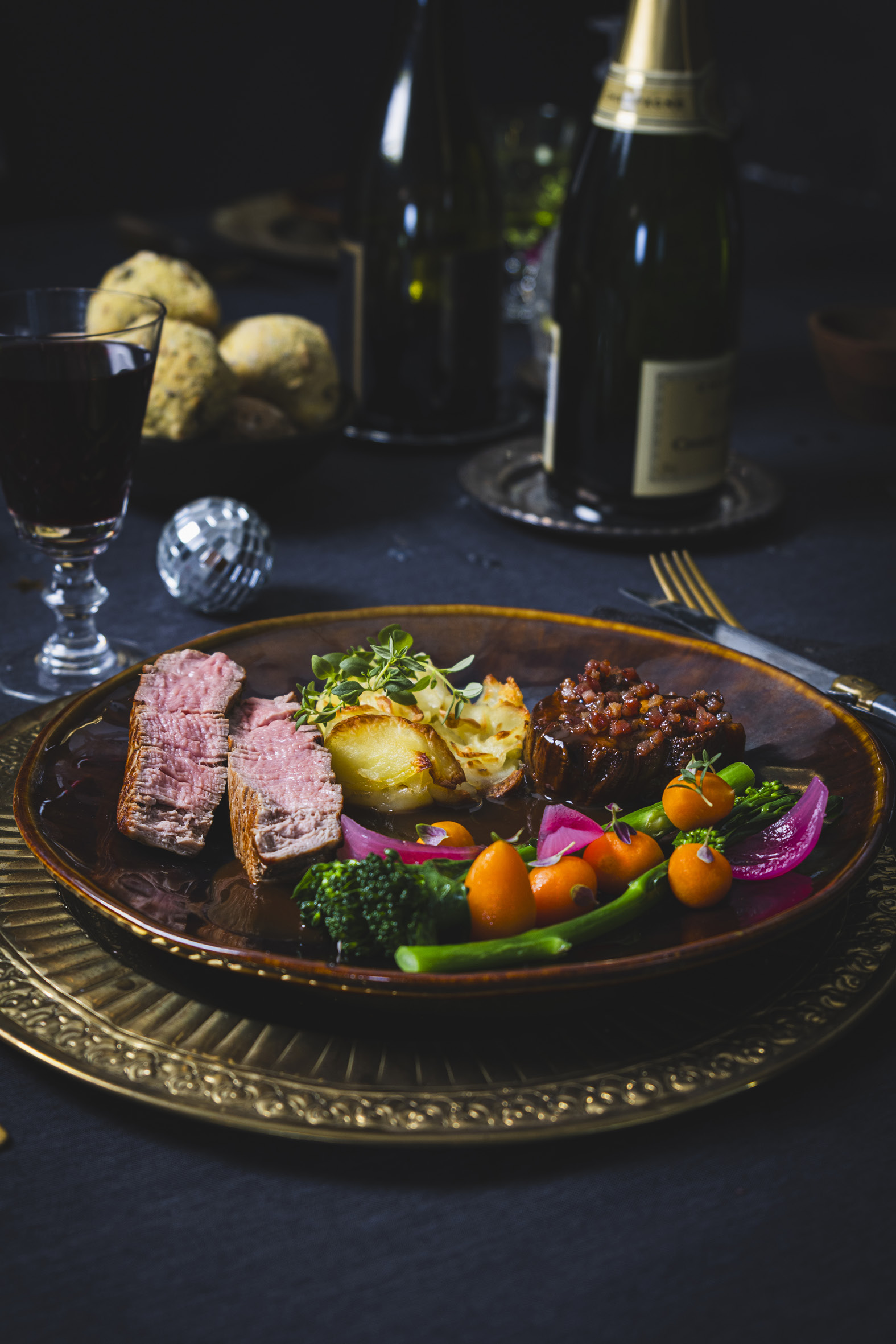 Oksemørbrad med sherry sauce – slow cook nakkefilet i bacon crust, asparges broccolini med pariser karotter og syltede løg- pomme Annette