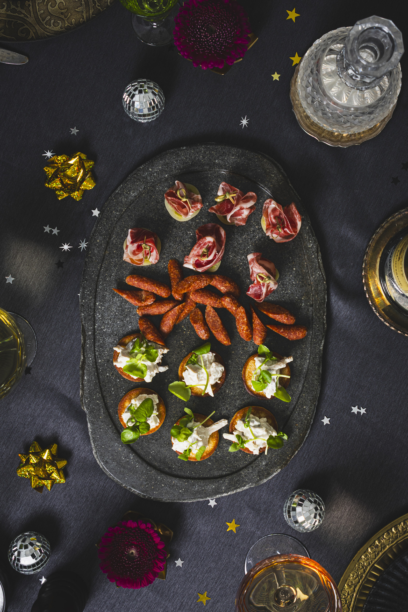 Start godt ud med en lækker tredelt slagter appetizer. Nyd slagterens snackpølser, som fungerer som en hurtig og smagfuld snack, lavet med kærlighed. Dernæst følger en lækker coppa på en bund af syltede grønne tomater og blinis med cremet kyllingesalat. En smagfuld start på en fantastisk aften.
